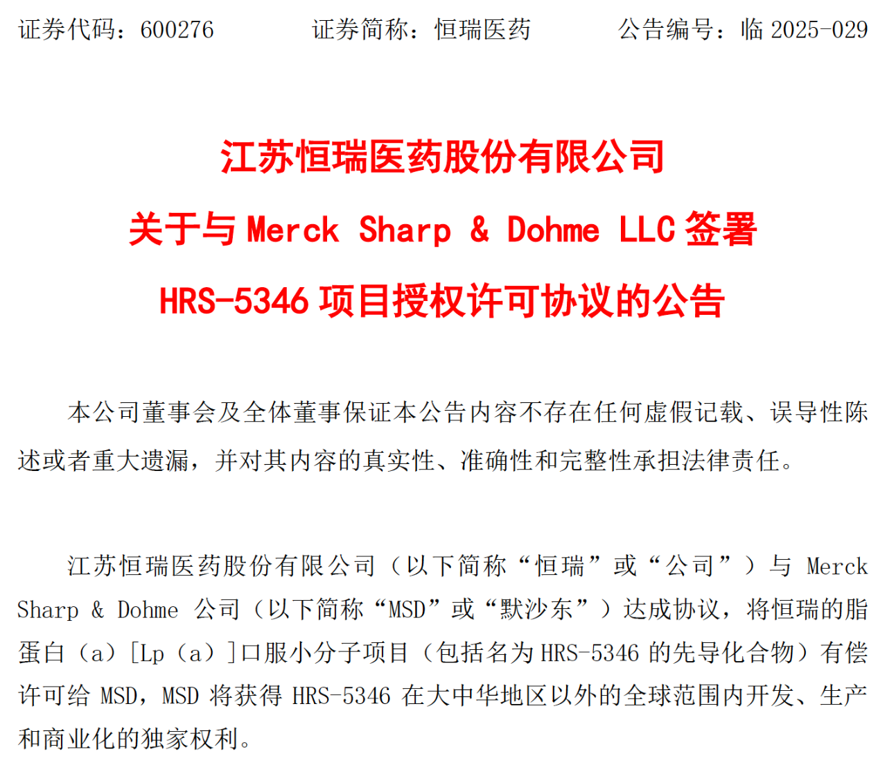 近日,恒瑞醫(yī)藥與全球醫(yī)藥巨頭默沙東就口服小分子Lp(a)抑制劑HRS-5346達成協(xié)議,該藥物在大中華區(qū)以外的全球開發(fā)、生產(chǎn)和商業(yè)化獨家權利已成功授權給跨國藥企默沙東,恒瑞醫(yī)藥將收取2億美元的首付款,并有資格獲得不超過17.7億美元的與特定的開發(fā)、監(jiān)管和商業(yè)化相關的里程碑付款,以及如果相關產(chǎn)品獲批上市,基于HRS-5346的凈銷售額的銷售提成。這標志著中國本土創(chuàng)新藥研發(fā)實力再次獲得國際認可。