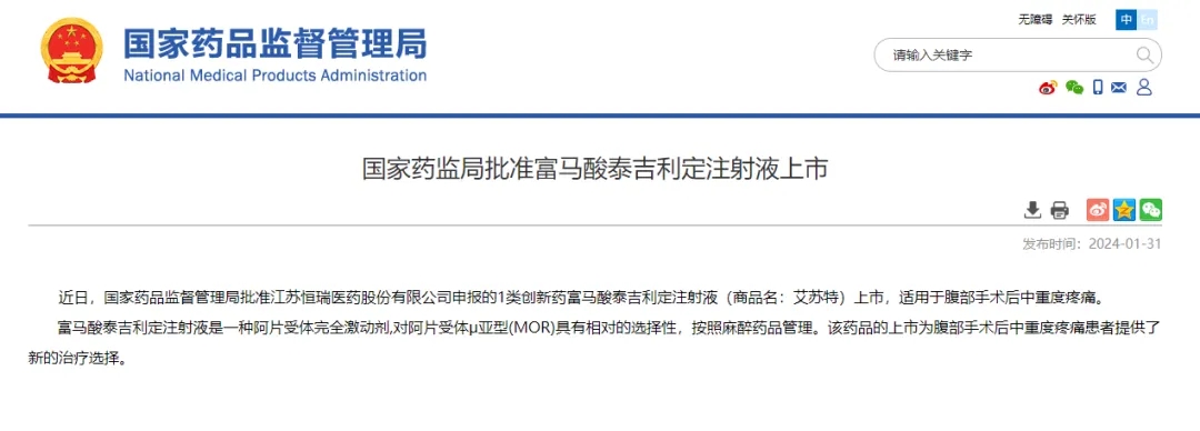 2024年1月31日,中國國家藥品監(jiān)督管理局(NMPA)官網(wǎng)宣布批準恒瑞醫(yī)藥1類創(chuàng)新藥“富馬酸泰吉利定注射液”(商品名:艾蘇特)上市,適應癥為腹部手術后中重度疼痛。 湖北天勤生物科技股份有限公司(以下簡稱“天勤生物”)表示熱烈祝賀。天勤生物子公司湖北天勤鑫圣生物科技有限公司(以下簡稱“天勤鑫圣”)作為“富馬酸泰吉利定注射液”項目的合作伙伴,與恒瑞醫(yī)藥緊密配合,在3.5個月內(nèi)完成了該品種關鍵代謝產(chǎn)物的重復給藥毒性試驗、生殖二段試驗和遺傳毒性試驗研究,為“富馬酸泰吉利定注射液”新藥的獲批上市提供了有力支持。 “富馬酸泰吉利定注射液”是一種阿片受體完全激動劑,對阿片受體μ亞型(MOR)具有相對的選擇性,按照麻醉藥品管理。研究數(shù)據(jù)顯示,該藥物不僅鎮(zhèn)痛效果顯著,起效速度快,能有效延緩術后疼痛反彈需補充鎮(zhèn)痛的時間;并且在保證鎮(zhèn)痛效果的同時,大幅降低了惡心、嘔吐和呼吸抑制等常見不良反應的發(fā)生率,極大地提升了患者的治療舒適度和安全性。 天勤生物祝賀“富馬酸泰吉利定注射液”順利獲批上市,該藥品的上市為腹部手術后中重度疼痛患者提供了新的治療選擇。同時,天勤生物將不斷探索和...