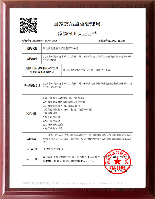 湖北天勤生物武漢分公司(安全性評價中心)是湖北省第一家民營GLP研究機構,現有一支近300人的專業技術團隊,具備了開展中國NMPA、美國FDA項目的質量管理體系和資質,同時通過了國際AAALAC完全認證。公司目前擁有超過10000m的設施,可開展嚙齒類和非嚙齒類的單次給藥、重復給藥、生殖【大鼠I、II和III段;小鼠I、II和III段;兔II和兔III段;伴隨食蟹猴(性成熟)重復給藥毒性試驗的生育力評價研究、食蟹猴伴隨胎盤屏障和血乳屏障的EFD試驗和增強的圍產期發育(ePPND)毒性試驗】、遺傳毒性(Ames、微核和染色體畸變)、免疫原性、安全藥理、局部刺激、毒代動力學和致癌等9項GLP試驗以及藥效、藥代動力學、毒性探索性試驗(DRF)等,尤其在生物制品、化藥和中藥和兒科用藥等方面擁有大量的非臨床評價經驗和成功案例,同時在上述藥物的生殖與發育毒性試驗設計、結果判定等方面積累了寶貴的經驗;建立了國內領先的食蟹猴生殖毒性與發育毒性研究平臺,是國家科技部重大新藥創制科技重大專項的藥物安全性評價示范平臺之一。